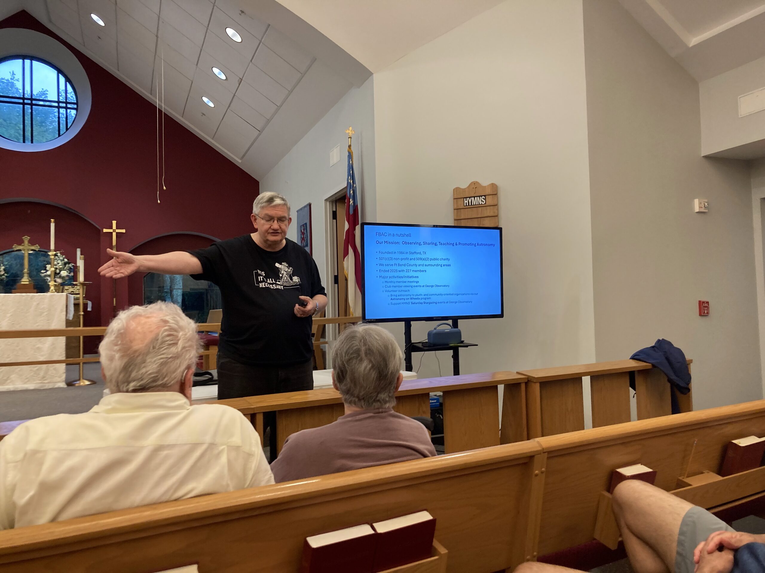 After a day of heavy rains, we decided to move forward with the AOW event at St. Catherine of Sienna Episcopal Church in Missouri City on Tuesday, April 21st, as an indoor only event.  We had about 15 brave souls attend the event which included a few members of a Girl Scout troop.  Starting off the presentation, Todd Dunnavant gave a brief talk about FBAC.  Leonard Ferguson gave the main presentation on the Artemis mission.  The same presentation he gave at the last FBAC meeting.